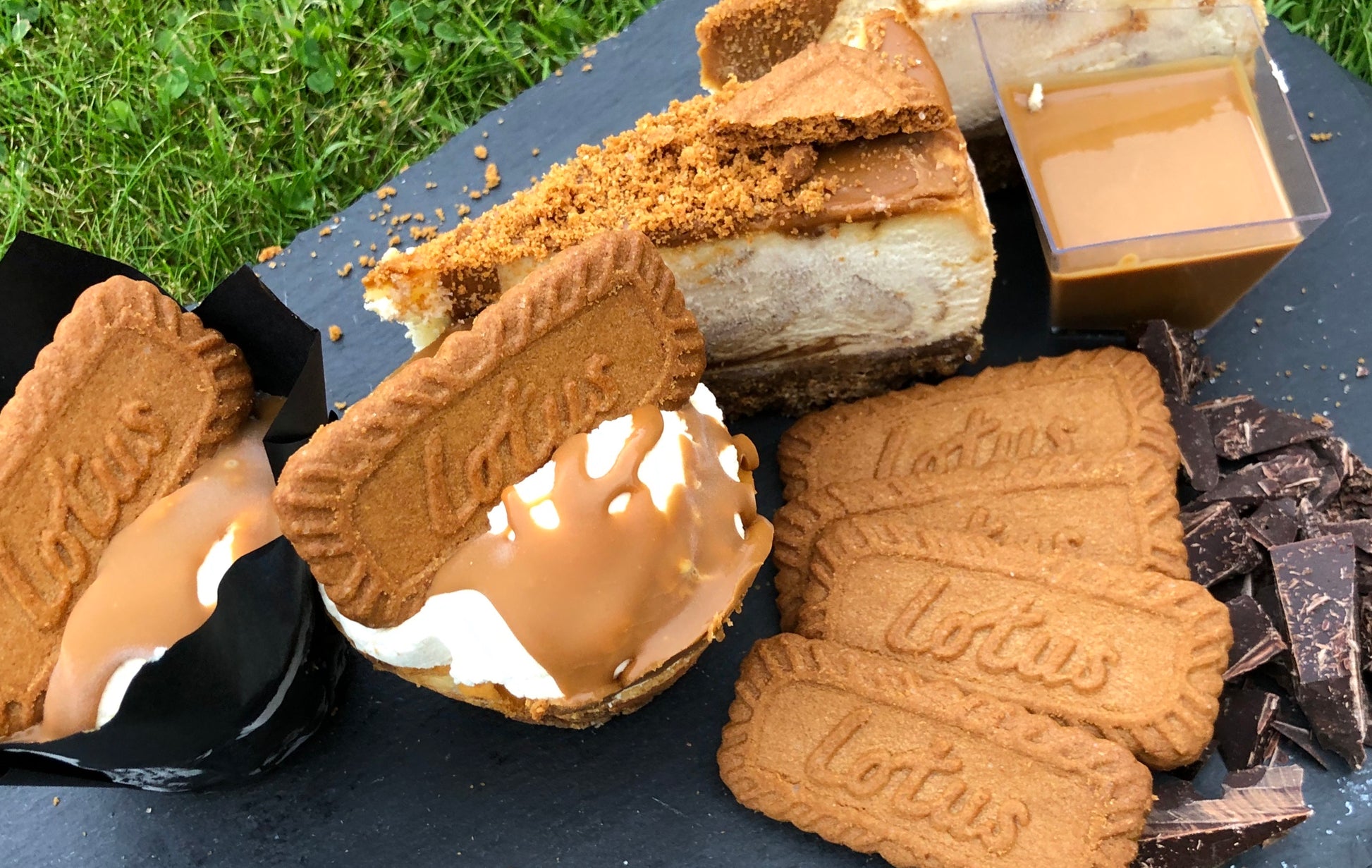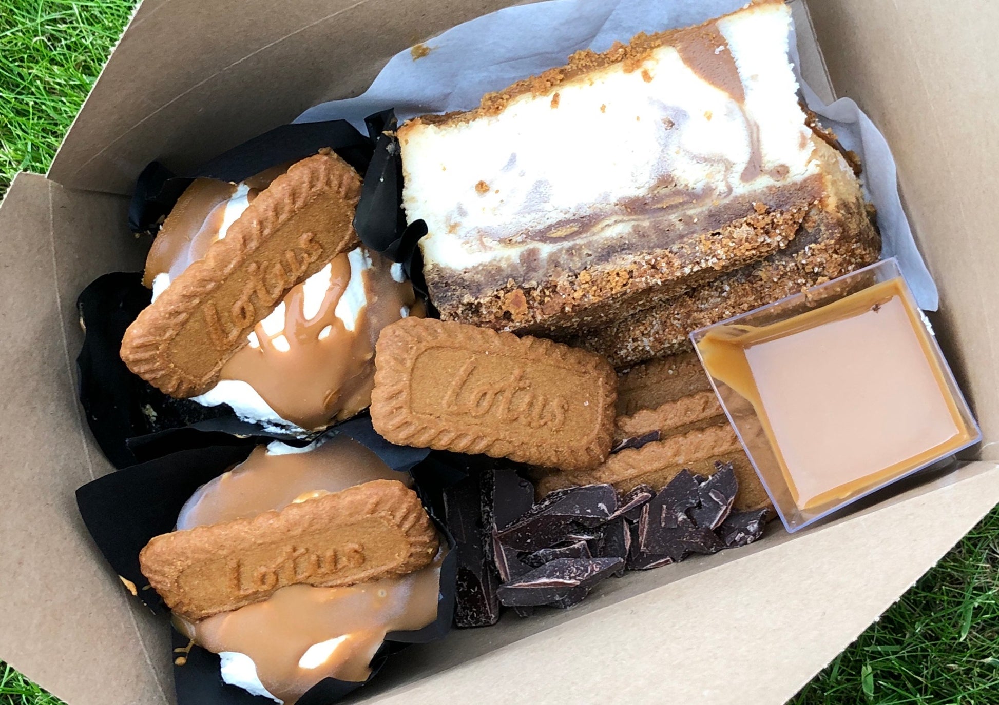 The Cheesecake box that is made for sharing! This comprises of a selection of Lotus Biscoff cheesecake slices, Lotus Biscoff cheesecake cupcakes, Individual lotus biscuits, shards of Caramelized chocolate and Lotus Biscoff drizzling sauce.